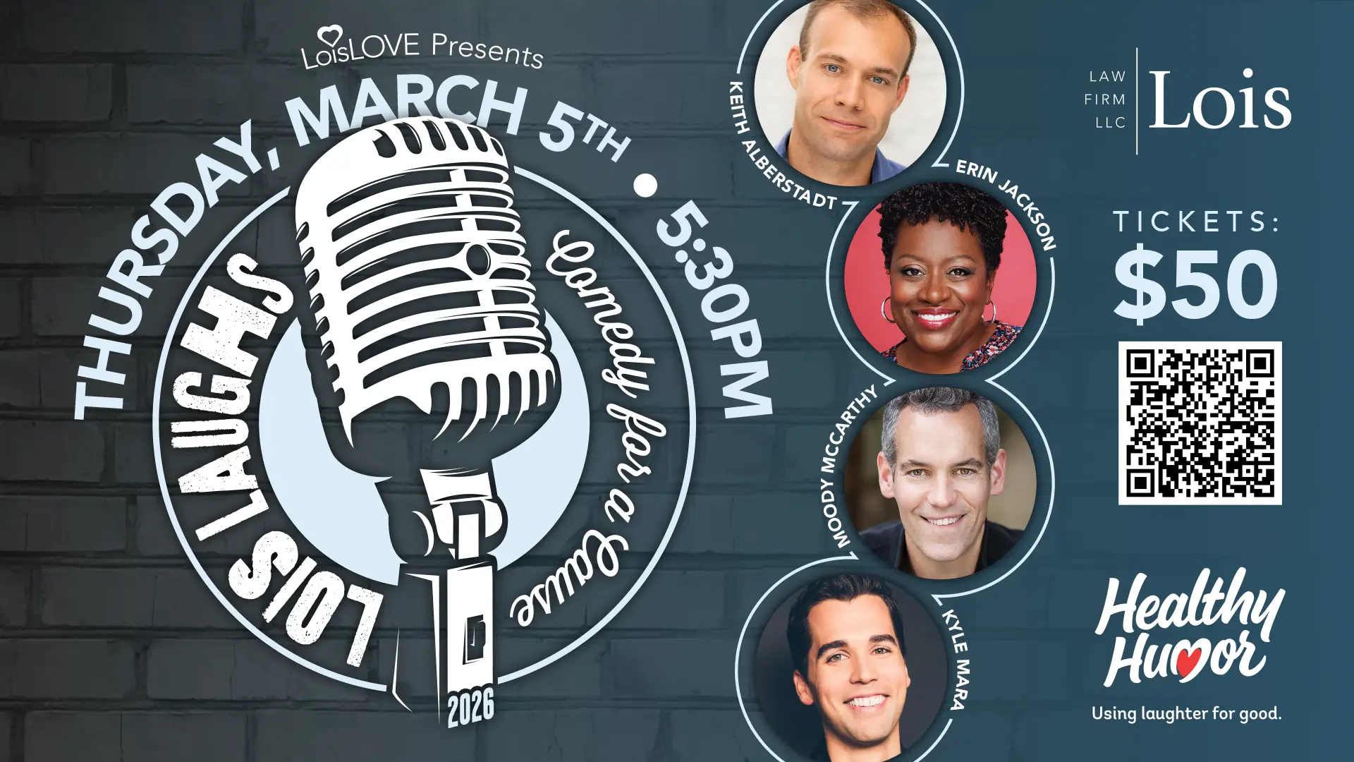 LOIS LAUGHS – Comedy for a Cause is a comedy show that’s open to friends and family of Lois Law Firm! Tickets are being sold via the donation website at $50 per person! Guests must be 21 and over only! All ticket sale proceeds will go directly to Healthy Humor, a non-profit organization whose professional performers create moments of joy, wonder, laughter, and comfort for hospitalized children and others most in need. In celebration of Healthy Humor’s 10th Anniversary, Lois Law Firm will match all donations!